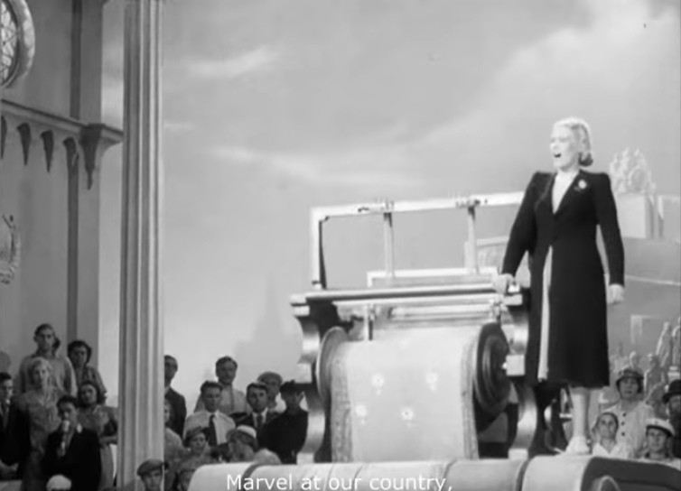 In Tanya our hero, played by the same actress, directed by the same director, is already born into Soviet life. She has a few of the qualities associated with the conscious positive hero. She is a citizen and seems quite willing two want to learn and work for the good of the nation and its people. Her first obstacle isn’t shame but a mistress who doesn’t appreciate her affinity for education. Upon meeting other citizens who share this same basic quality does she begin her path to transformation. She has found her collective and begins her work towards her own industrialization. Tanya’s internal struggle is she is simply not happy unless she’s the most productive worker who ever existed. This is why her path is not just her path, but a bright and radiant one. It is the best path, not just to be a so-so Soviet but to be so Soviet that you are the greatest representative of the ideals of the nation. It takes her years to achieve this goal and in a brilliant flashback scene, Tanya is taken through all of the stages of her citizenry as it eventually, literally, drives her to receive an Order of Lenin. This final flashback scene is probably the most important of the film as it shows there are many steps to becoming the perfect socialist citizen which can all can be achieved through living the ideals of socialism.