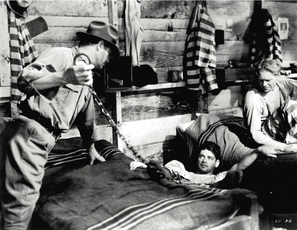 When Allen is caught up in a botched robbery and ends up on the chain gang. The judge sentences Allen for hard labor. This time he will not be paid. The next cut is a scene of a man being paid to put Allen in chains. The loud shock of rhythmic clangs as hammers hit steel cuffs surround the prison. The chains rattle loudly, but not loudly enough to rattle Allen out of bed in his first morning on the chain gang. When slapped suddenly out of bed and his chain thrown in his face he realizes how important these sounds will become to him. He needs to learn these chains are something he always has to hold on to, even when they are no longer attached to his body.