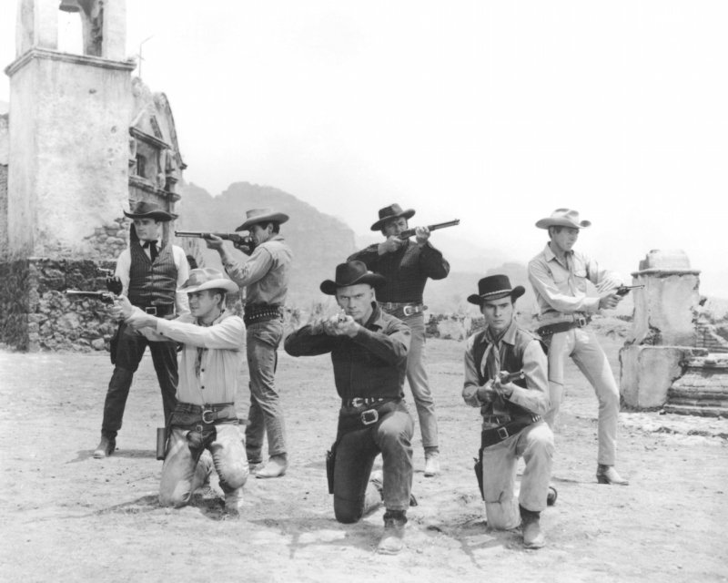 The principle cast in a publicity still for ‘The Magnificent Seven’, directed by John Sturges, 1960. Left to right: Robert Vaughn as Lee, Steve McQueen as Vin Tanner, Charles Bronson as Bernardo O’Reilly, Yul Brynner as Chris Adams, Brad Dexter as Harry Luck, Horst Buchholz as Chico, and James Coburn as Britt. (Getty Images)